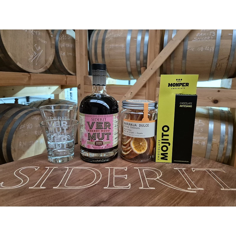 Sorprende con un regalo único: vermut reserva en barrica de cerezo artesanal, botánicos de naranja deshidratada, chocolate Monper de sabores variados y dos vasos de cristal. Perfecto para foodies, vermutlovers y amantes del aperitivo. ¡Un detalle inolvidable!