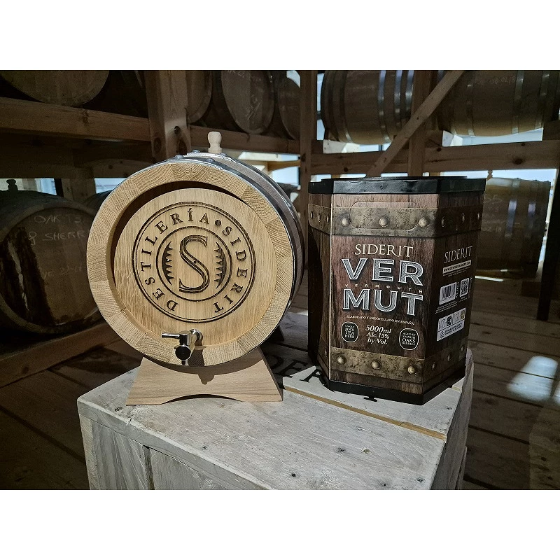 Si eres de los que disfrutan en casa, esta es la tuya...barrica de roble blanco español de 5 litros y 5 litros litros de vermut Siderit para envejecer en tu propia casa, una experiencia única en la que podrás degustar como evoluciona el producto con el paso del tiempo. La barrica es igual que una grande en un tamaño reducido, tiene un tostado muy suave que en los primeros llenados de la barrica, la evolución se comprobará en apenas unos días. El vermut viene en un formato Bag in Box de 5 litros con un grifo para poder servir directamente del envase o rellenar la barrica.